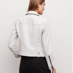 A cool off-white hue softens the swagger of a supple lambskin-leather biker jacket with silvertone hardware.