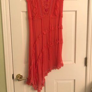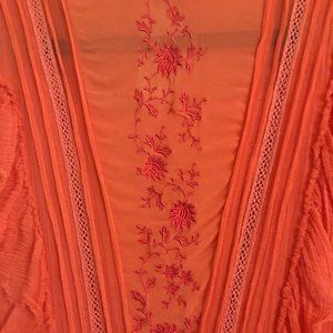 Beautiful embroidered dress from Allsaints. It has an incredible embroidered floral pattern on the chest. It is double layered, the top layer being a chiffon. Has a drawstring waist and an asymmetrical hem. There is a slight hole in the back of the dress, I think with how delicate the material is that's why it tore. Only worn a handful of times.
