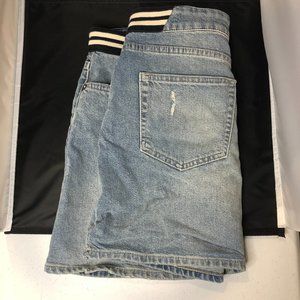 Features a stretchy striped waist band for visual interest, as well as some light distressing throughout. Excellent condition, no flaws. Perfect for the spring and summer.