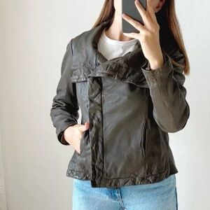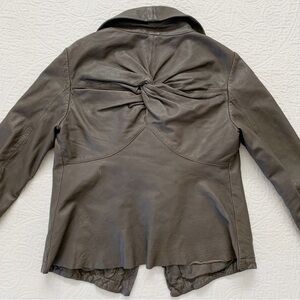 Wrap-front leather jacket with large fold-down collar. Ruched/Twisted detail on the back. Mix of modern and moto styling.
