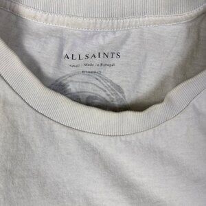 A white short sleeve t-shirt featuring Allsaints' distinctive graphic design. Crafted from soft cotton, this piece blends casual comfort with artistic visuals.