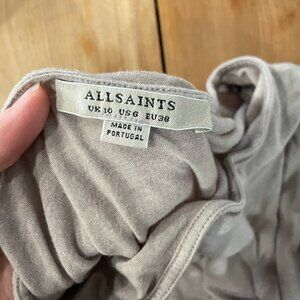 Wool + Viscose sleeveless dress with raw hem and twist at waist. Looks incredible on and is so cozy and stretchy. A forever piece in great condition. Greige/tan color.
