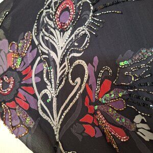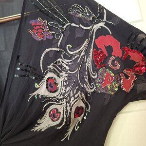 Beautiful and delicate early 2000s Allsaints Kaftan with feather and floral print plus beading and sequins and a side zip. Overall good condition, just has a couple places with flaws in the beading