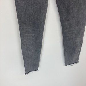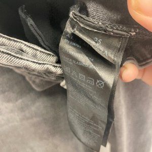 all saints black/gray grace slashed style skinny jean. Distressed knees, raw hem. Gently used with no flaws, size 25. See photo for approx. measurements in inches.