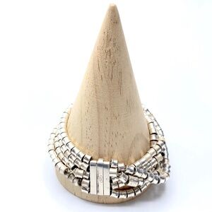A luxurious multi-strand statement piece with a substantial presence, featuring five rows of gleaming sterling silvers. Originally purchased at the Links of London Grand Central Station flagship store. This iconic brand was made famous by HRH The Princess of Wales (then Kate Middleton) who helped popularize Links of London by wearing their pieces in her engagement photos. The beloved British luxury brand is now a cherished part of jewelry history since closing their doors.