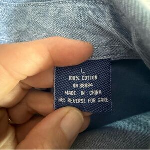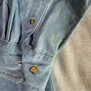 Adorable snowman denim button down shirt. With material stitching across bottom of shirt would make it really cute worn as a cardigan. Snowman accents