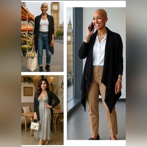 Elevate your wardrobe with this luxurious Allude black Lagenlook artist open-front layering Asymmetrical cardigan, crafted from 100% cashmere for an ultra-soft and elegant feel. This versatile draped design is perfect for layering effortlessly boho chic for the office, a casual stroll, or dressed up for an evening out boho Gypsy flowy Business Casual Allseason Travel Versatile Atleasure Relax Stylish supersoft Packable