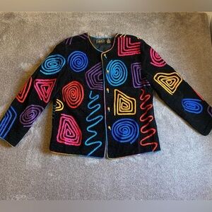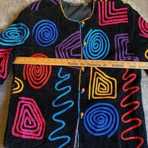 Vibrant jacket with spiral patterns in red, pink, blue, and yellow on a black base. Unique and eye-catching design. Vintage