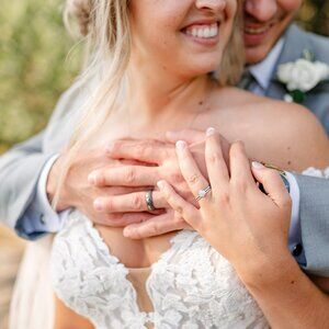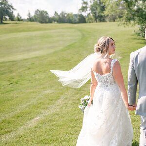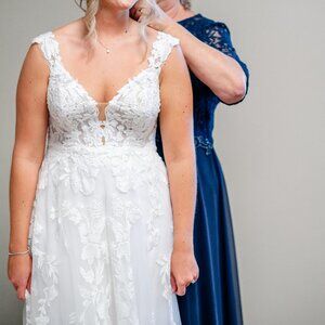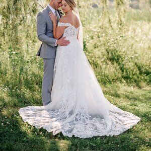 This is such a beautiful and elegant wedding gown! This dress is an off the shoulder style, with elastic in the straps to wear over the shoulders if desired. The back features a long train with buttons all the way down the back of it. This dress can be buselled, 4 total buttons.