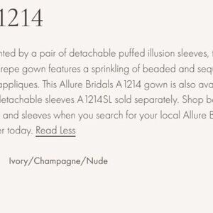 Allure Bridal description: Accented by a pair of detachable puffed illusion sleeves, this chic crepe gown features a sprinkling of beaded and sequined lace appliques. This Allure Bridals A1214 gown is also available with detachable sleeves A1214SL sold separately. Shop both gown and sleeves when you search for your local Allure Bridals retailer today.