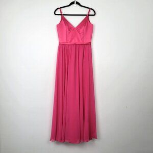 Excellent. Gently preowned condition. V-neck bodice with a flattering fit-and-flare silhouette flowing into a full-length A-line skirt. Features spaghetti straps, empire waistline, and a hidden back zipper with hook and eye. Unaltered.