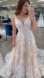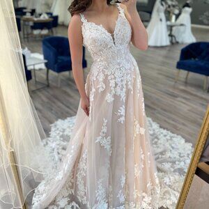 Stunning all over sparkly lace applique detailed wedding dress in an a-line silhouette, lined bodice and v-neck plunge neckline with lace straps. It has a scoop back and the train is topped with bridal buttons down. Gown zips up in the back.