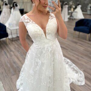 Stunning all over lace applique detailed wedding dress in an a-line silhouette, lined classic bodice and v-neck plunge neckline with cap sleeves. It has an open scoop back and the train is topped with bridal buttons down the train. Gown zips up in the back.