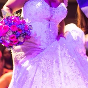 Worn once, strapless, has been cleaned, size 20 but altered, extra cathedral train, zip back, jacket shown not included, comes with garment bag, paid $3200, ivory color. Jacket not included.
