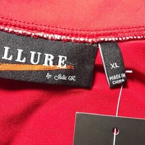 Ladies red Corset style detailing at the waist dress by Allure. Size XLg. The exquisite side wrap detailing adds a glamorous touch to this dress. Straight line hem lands above the knee. Lipstick red with silver-tone grommet and clear imitation stones. Measures approximately 23" across front - 18" from armpit to sleeve hem and 30" long from armpit to hem. 90% polyester and 10% spandex. Retails for $90.00. Comes from smoke free home.