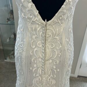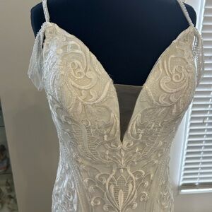 Pretty light ivory lace with sequence fit, and flare style with off the shoulder cap sleeves and spaghetti straps dress was a store sample in excellent condition just a few loose beads and threads has not been altered