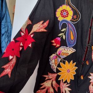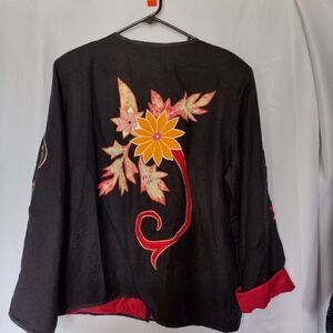beautifully appliqued blazer with red lining. handmade glass barrel buttons. pit to pit 25" length 26"