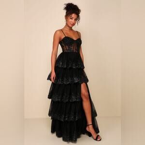 Alluring Sensation Black Tulle Embroidered Tiered Maxi Dress MEDIUM NWOT