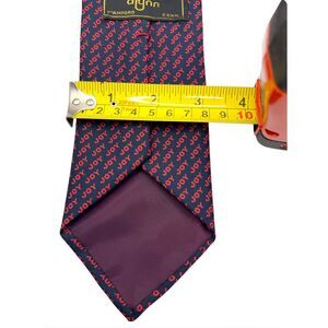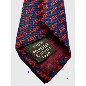 This is an Alynn Neckwear Holiday tie, featuring a navy blue background with a repeating "JOY" pattern in red, and a label indicating "Creative Expressions by Alynn, Stamford, Conn."