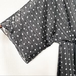 Retro style black and white polka dot dress from Allyson. Black with shimmer stripes and white polka dots. Sheer arms and back, lined in the body. Deep v-neck, fabric belt with loops. Hi lo ruffle hem.