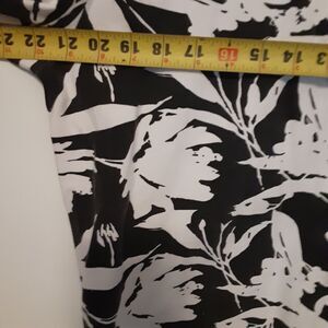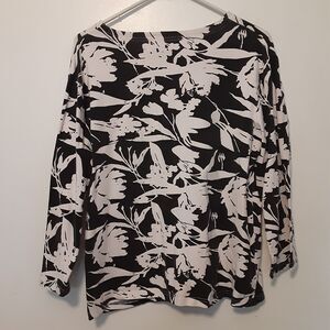 This is an Allyson Whitmore women's top in size XL with long sleeves and a snap closure. It features a black and white floral pattern with studded accents. Made of polyester, spandex, and cotton, this button-up top is easy to care for and suitable for all seasons.