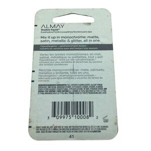 This Almay Shadow Squad eyeshadow palette features four finishes: matte, satin, metallic, and glitter. It is ophthalmologist tested and hypoallergenic, suitable for sensitive eyes.