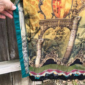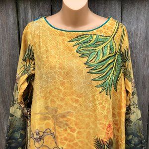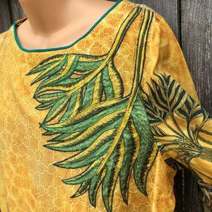 Features: Embroidered palm fronds on shoulder. Underarm gussets. Black trim on front hem. Chiffon insets. Lightweight, almost sheer fabric.