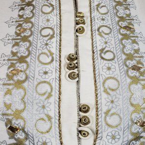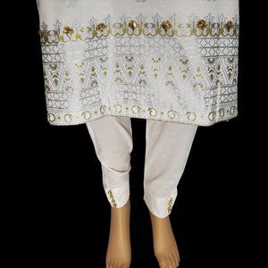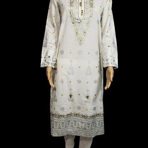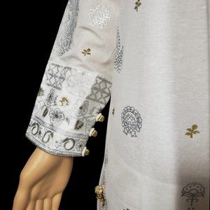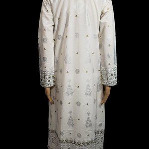 1. Karandi Material Off-White Block-Printed Long Length Kameez with Full Length Sleeves; full shiny design printed front and back, embellished with Gota Work, Shiny Lace, and Golden Buttons