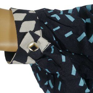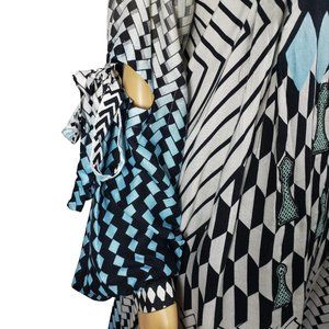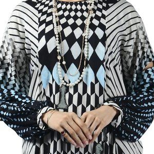 Relaxed Style with Bold Illusion Print Design, Cut Along Bow on Full Length Balloon Sleeves with Appliqued Embroidery and Box Pleats on Front and Button on back Neck