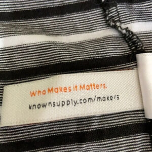 Almond Surfboards Crew Neck Striped Short Sleeve Tee Shirt in a size medium. Excellent pre-owned, like new condition. Doesn't appear to have been worn or washed. Extremely high quality 100% cotton, black and white stripes, one chest pocket, short sleeves, signed by the maker of the tee on the inside tag. Approximate measurements: 20" chest, 26" length. From Known Supply.