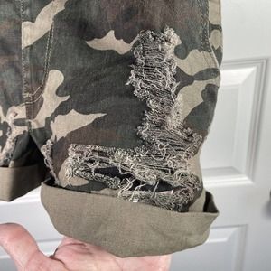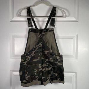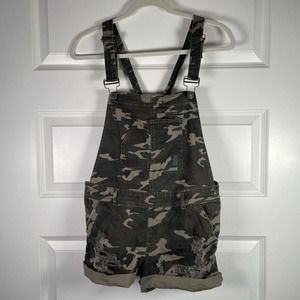 Almost Famous Bib Overall Shorts 9 Green Tan Camo Denim Distressed Shortall
