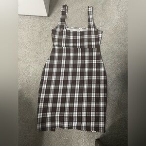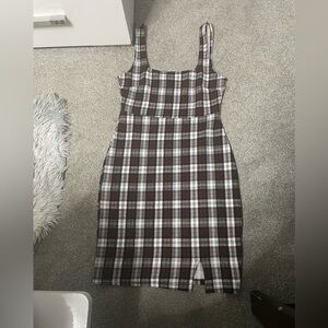 Almost Famous Brown and White Plaid dress with a slit on the side.