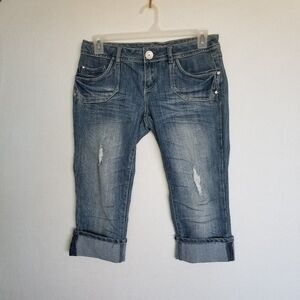 Almost Famous Distressed Capris Cuffed Embroidered Pockets Women's 11