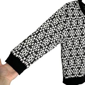 Almost Famous Geometric Print Knit Cropped Blouse. Size large. In gently preowned condition. 3/4 length sleeves. Black hem and cuffs. Black and white geometric Diamond print. Round neck. Moderately cropped length. Polyester/spandex blend.