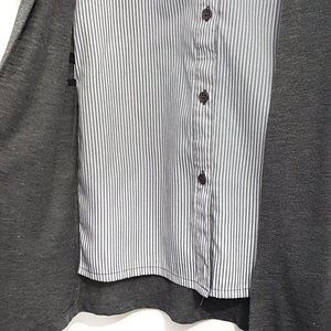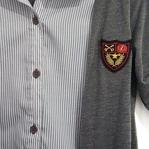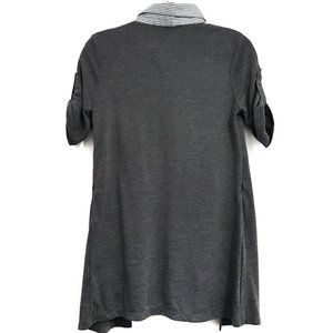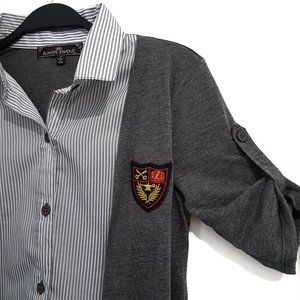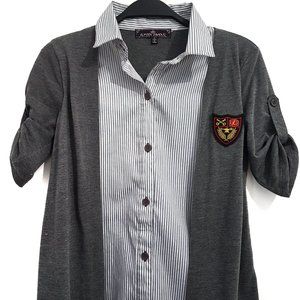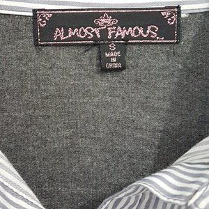 Almost Famous Gray with Blue/White Striped Badged-Accent Short Sleeve Top