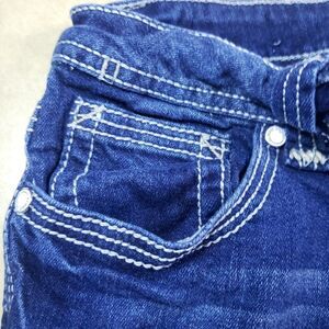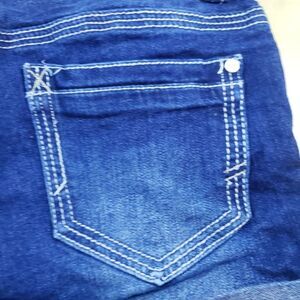 Description: Almost Famous low-rise blue jean shorts in juniors size 3, featuring classic 5-pocket styling and a light wash. These shorts are in good to excellent pre-owned condition.