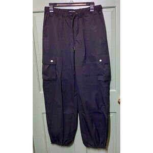 Upgrade your street style with these Almost Famous Juniors Sz M black drawstring elastic waist parachute pants. The tapered leg style and jogger design give a comfortable and trendy look. Made of high-quality polyester material, these pants are durable and perfect for any casual occasion. The solid pattern, grunge theme, and retro 90s vibe make these pants a must-have for any fashion-forward woman's wardrobe. The drawstring closure and elastic waist provide a customized fit for maximum comfort. These pants are perfect for women who want to make a statement without compromising on comfort.