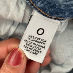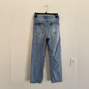 Trendy light blue jeans with distressed details. Straight leg design. Perfect for casual wear.