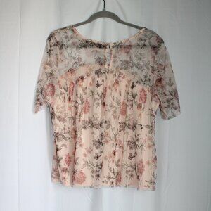 Almost Famous Light Pink Floral Butterfly Mesh Sheer Short Sleeve Blouse Large