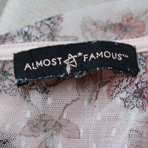 Almost Famous brand sheer pink mesh blouse, featuring a gray floral and butterfly pattern. The shirt is lined at the bust and below. Short sleeves are sheer.