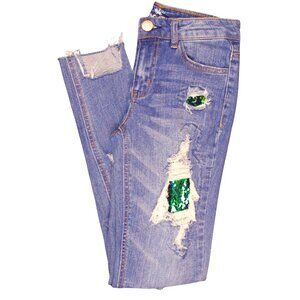 Almost Famous Mid Rise Distressed Sequin PatchSkinny Jeans –Size 0