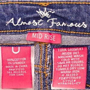 Add a little sparkle to your denim collection with these Almost Famous Mid Rise distressed skinny jeans. Designed with bold shredded detailing and unique green sequin patches underneath the rips, these jeans give off a trendy, edgy vibe. Classic 5-pocket style with zip fly and button closure.