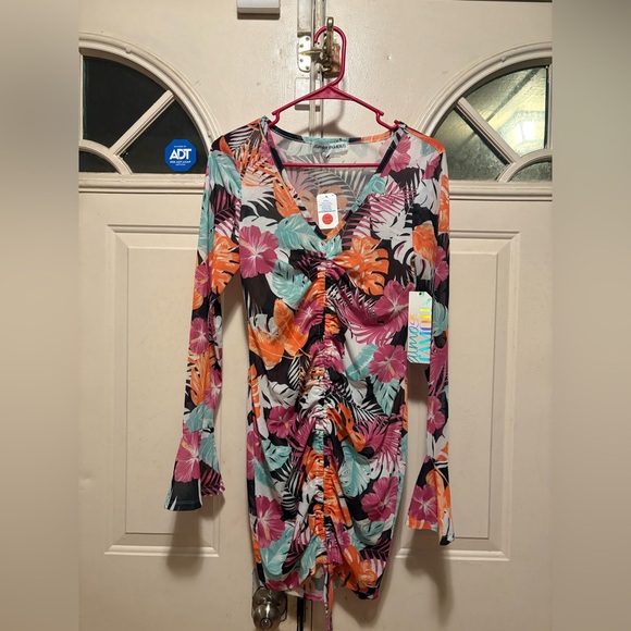Stylish dress with a vibrant multicolor pattern. Features a mix of colors for a bold look.