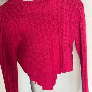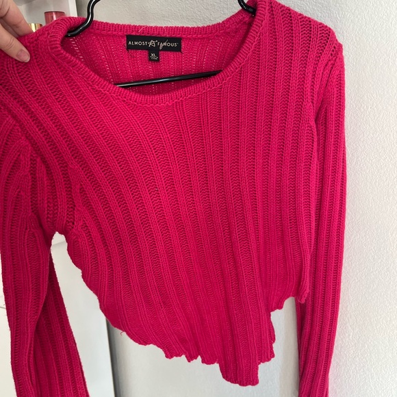 Vibrant pink ribbed knit sweater by Almost Famous. Features a cropped design and long sleeves.