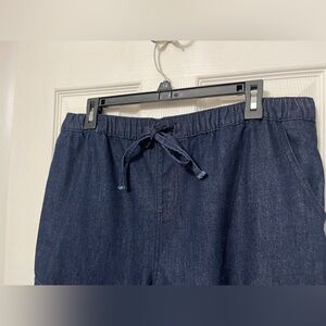 Almost Famous Pull On Dark Denim Jogger Cargo Jeans Elastic Waist Size Large. Approximate measurements: Waist flat front 16.5" unstretched, 18.5" stretched; hips 21.5"; rise 11"; inseam 28". Drawstring waist; the cargo pockets on the sides are faux, but there are pockets at the waist. 74% cotton, 19% polyester, 7% rayon. In very good pre-owned condition, please refer to photos. Cross-posted.
