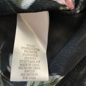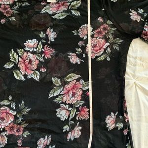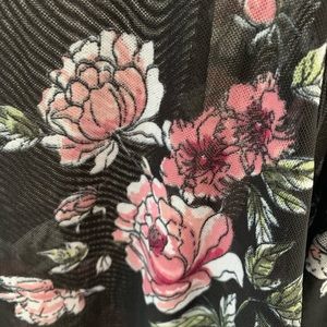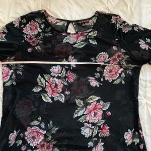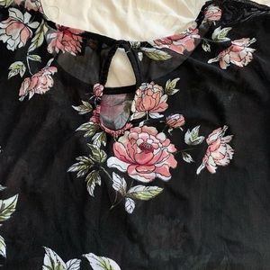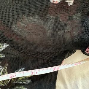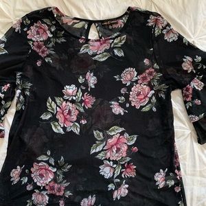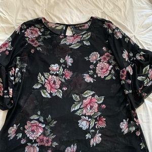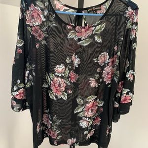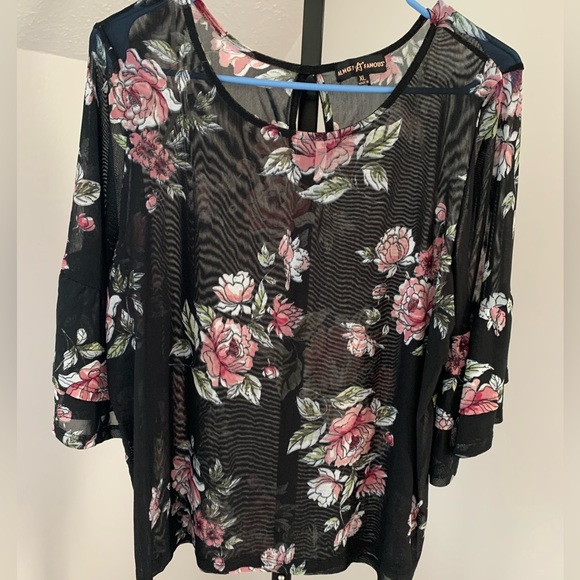 Almost Famous sheer top black with floral print. Size XL top with beautiful two tiered ruffle sleeve. Pit to pit is 22” and length is 23”. Keyhole in the back of this top made of 95% Polyester and 5% Spandex.