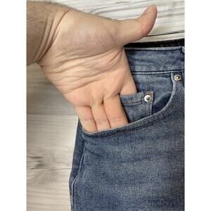 Gently worn, no visible flaws noted. Intentional raw/frayed hems by design. No holes or stains observed. Button and zipper function properly.