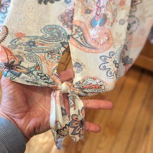 This is a thin and flowy top, perfect for spring! Fun, colorful print makes it easy to match to your pants and accessories, ties at the bottom so you can adjust where you'd like it to sit on you, and has the cutest lace going down the sides of the arms. It is in excellent used condition, and measurements are posted in the pictures. It's pretty accurate as a medium, though, not oversized.