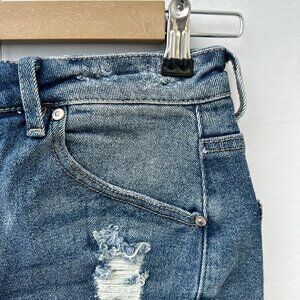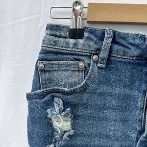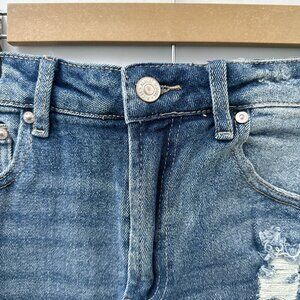 Tags: denim shorts, high rise shorts, distressed shorts, women's blue shorts, frayed hem shorts, summer fashion, cotton shorts, casual shorts, ripped shorts, Almost Famous shorts, trendy denim, women's size 3, blue denim shorts