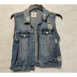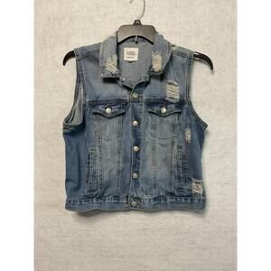 Almost Famous Vest Womens Large Blue Distressed Denim Button Front Sleeveless